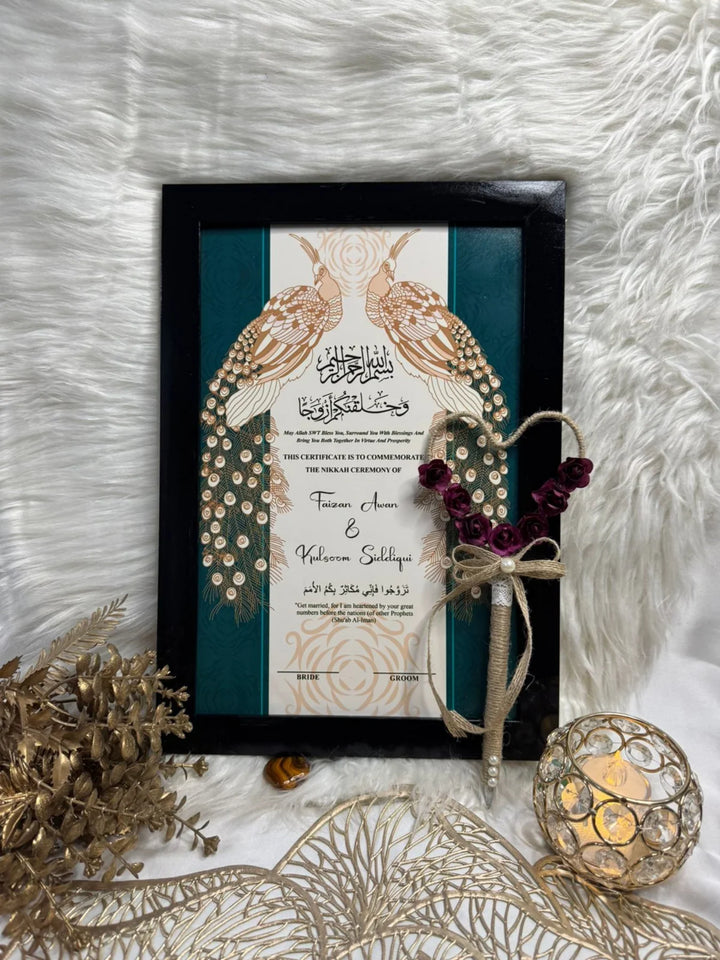 Crafted with high-quality materials and finished with precision, the Dual Peacock Lovely Nikah Frame can be personalized with your names, Nikah date, and a Quranic verse or Dua, turning it into a heartfelt keepsake that reflects both faith and beauty.
