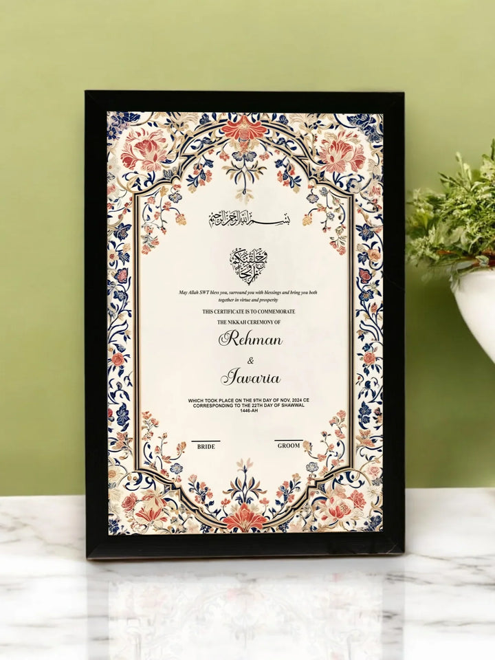 Crafted with premium-quality materials and customizable details, the Floral Lovely Nikah Nama Frame turns your sacred vows into a work of art — preserving the beauty of your Nikah forever.