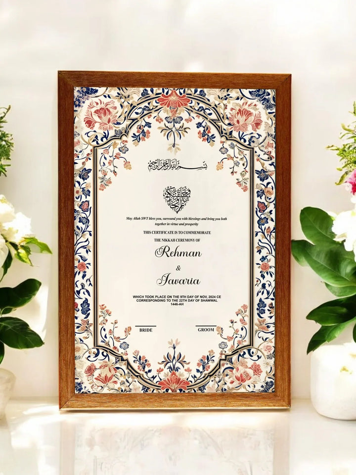 Let your love bloom with the Floral Lovely Nikah Nama Frame, a romantic fusion of Islamic elegance and floral beauty. Designed with delicate blossoms and graceful patterns, this frame captures the tenderness and joy of two souls united through Nikah.