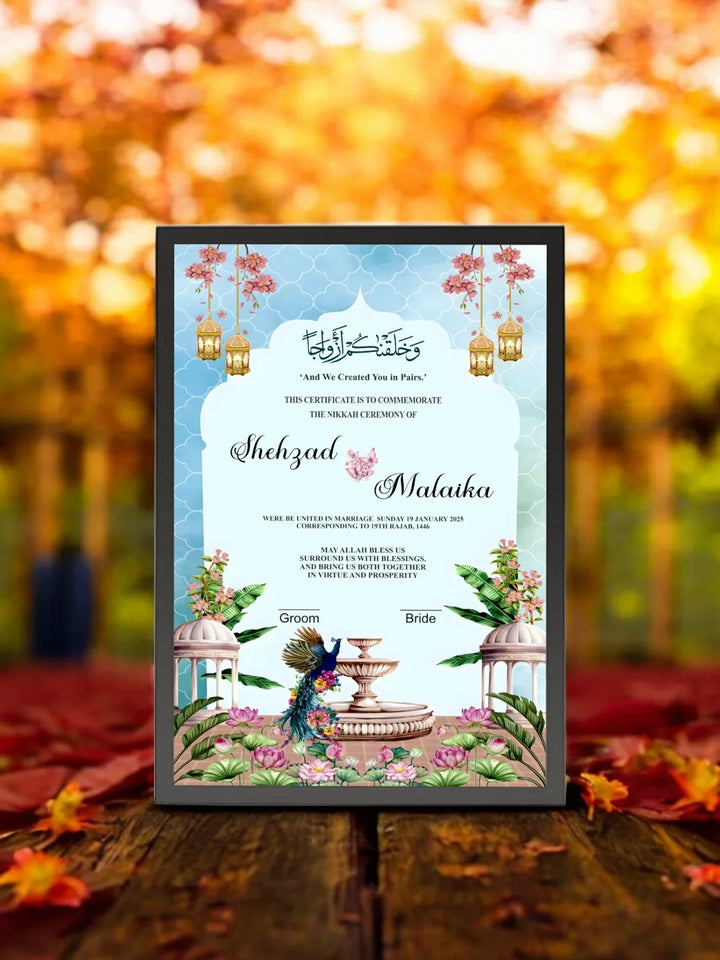 Whether displayed in your home or presented as a thoughtful wedding gift, this Floral Peacock Taj Nikah Frame symbolizes love, faith, and unity — making it a memorable addition to any Muslim wedding celebration.