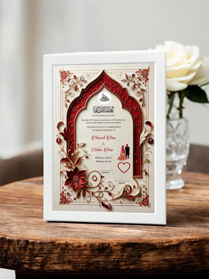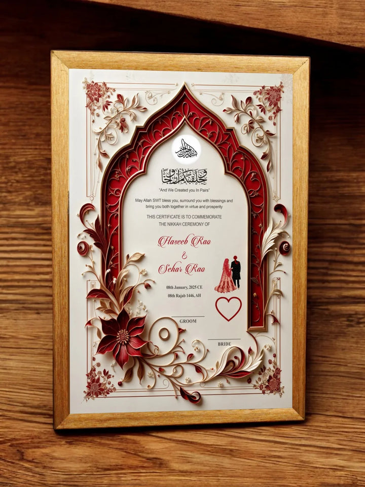 Featuring a luxurious red and gold theme, the Laal Ishq Nikah Frame adds warmth, elegance, and depth to your Nikah display. Every detail is thoughtfully designed to reflect love, devotion, and the blessings of Allah, making it a perfect addition to your wedding memories or Islamic home décor.