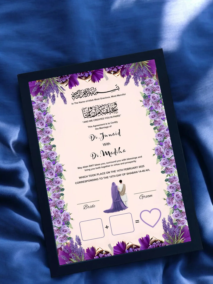 Celebrate your everlasting bond with the Lovely Couples Purple Floral Nikah Frame, a romantic and refined keepsake that beautifully captures the essence of your sacred union. Inspired by the serenity of purple blooms and the blessings of faith, this frame transforms your Nikah certificate into a timeless piece of art.