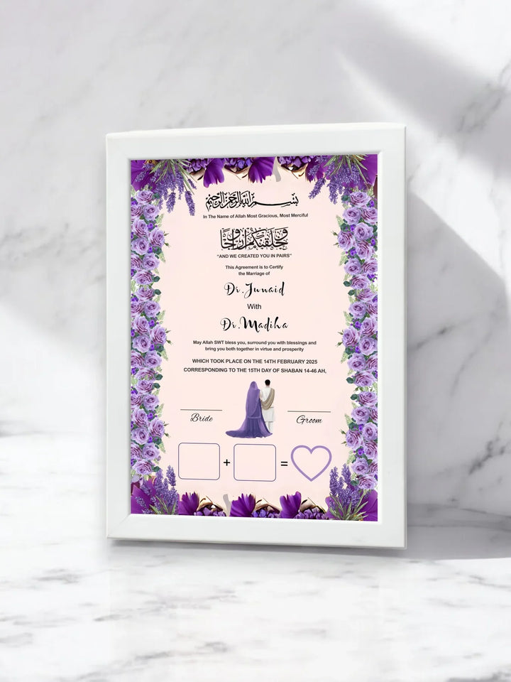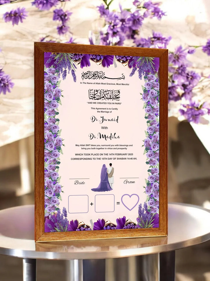 Expertly crafted with premium-quality materials, the Lovely Couples Purple Floral Nikah Frame can be personalized with your names, Nikah date, and a Quranic verse or Dua, creating a one-of-a-kind treasure that preserves your love story forever.
