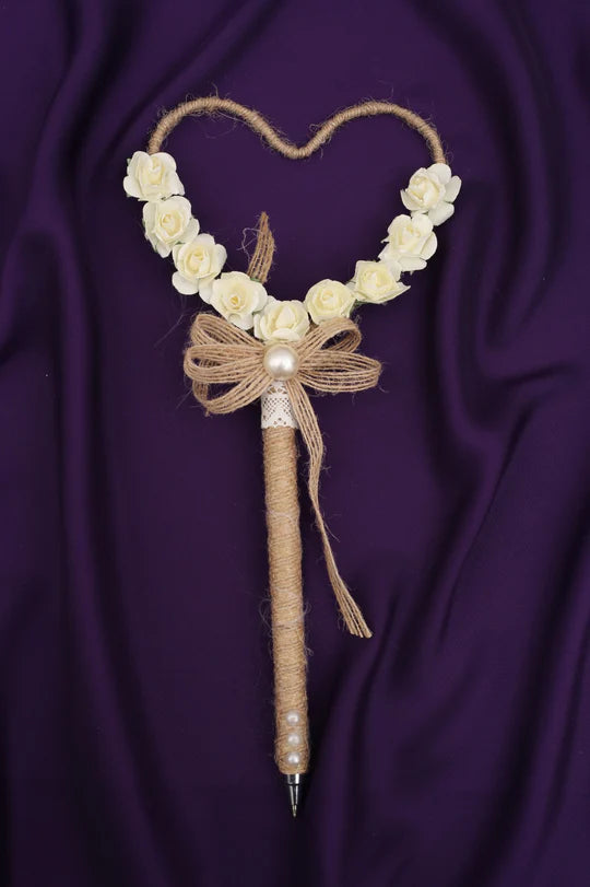 Bring timeless elegance to your Nikah with this luxurious antique-style pen ๐๏ธโจ. Featuring a heart-shaped design, white tulip flower, and thread detailing, it exudes a beautiful vintage charm perfect for your wedding ceremony or as a keepsake gift ๐.