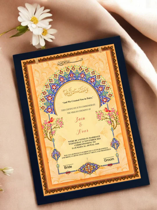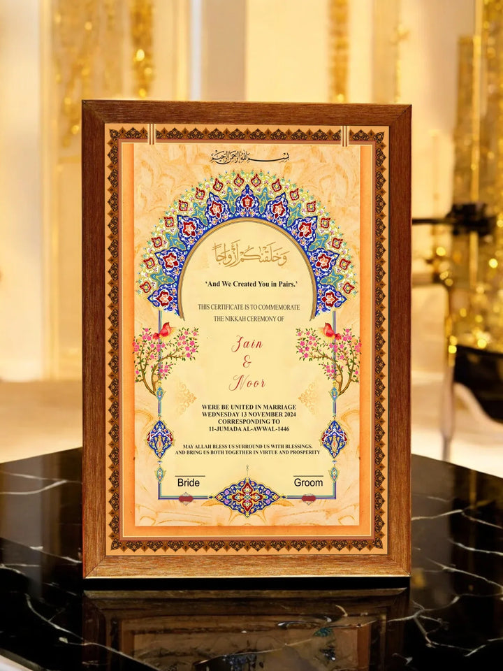 Each frame is fully customizable — personalize it with the couple’s names, Nikah date, and a Quranic verse or Dua to make it a truly unique and meaningful piece that tells your love story through faith and artistry.