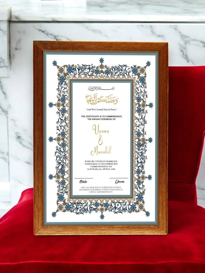 Each frame is fully customizable — personalize it with the couple’s names, Nikah date, and a Quranic verse or Dua to create a one-of-a-kind masterpiece that reflects love, unity, and faith.