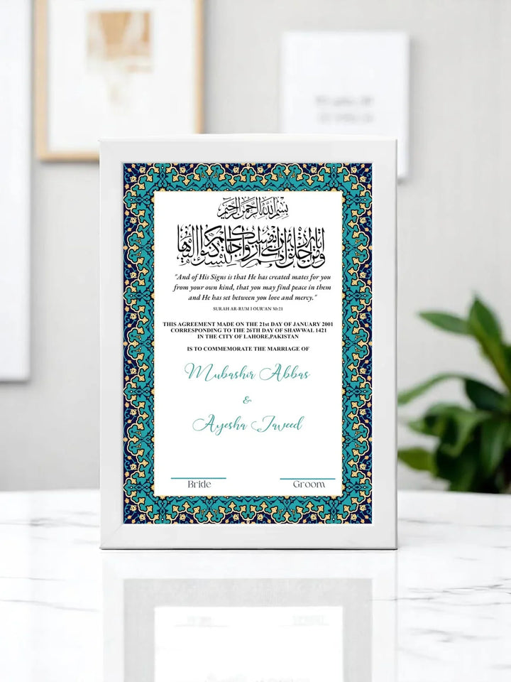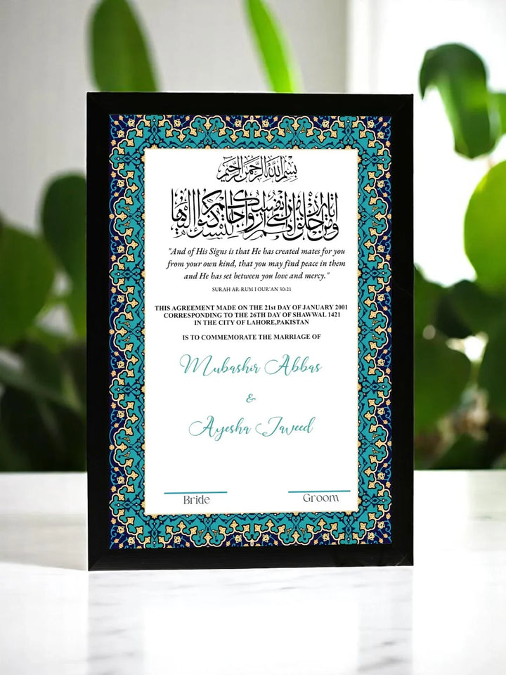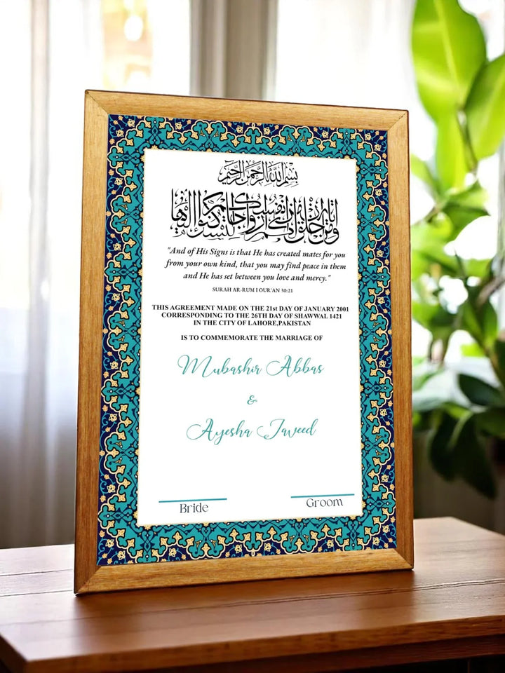 Each frame is crafted with premium materials and can be personalized with your names, Nikah date, and a Quranic verse or Dua to reflect your journey of love and faith.