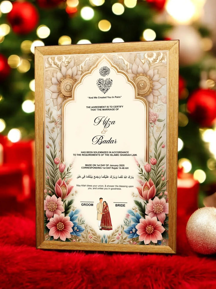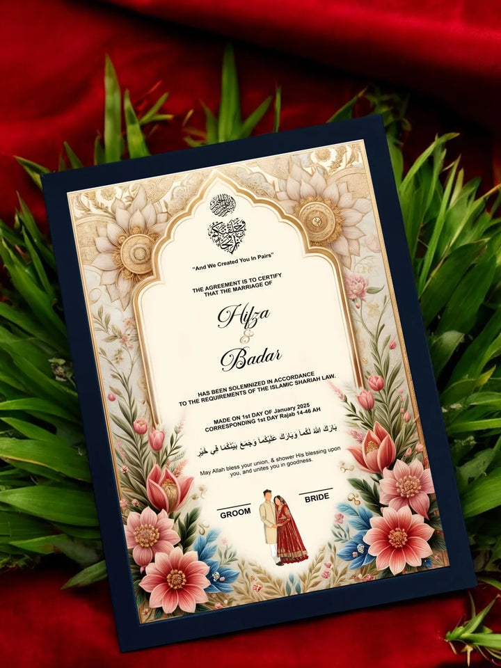 Celebrate your sacred union with the Print Pink Floral Nikah Frame, a soft and romantic masterpiece designed to showcase your Nikah certificate in the most elegant way. Featuring a beautiful pink floral print, this frame symbolizes love, purity, and new beginnings — perfectly capturing the essence of your special day.