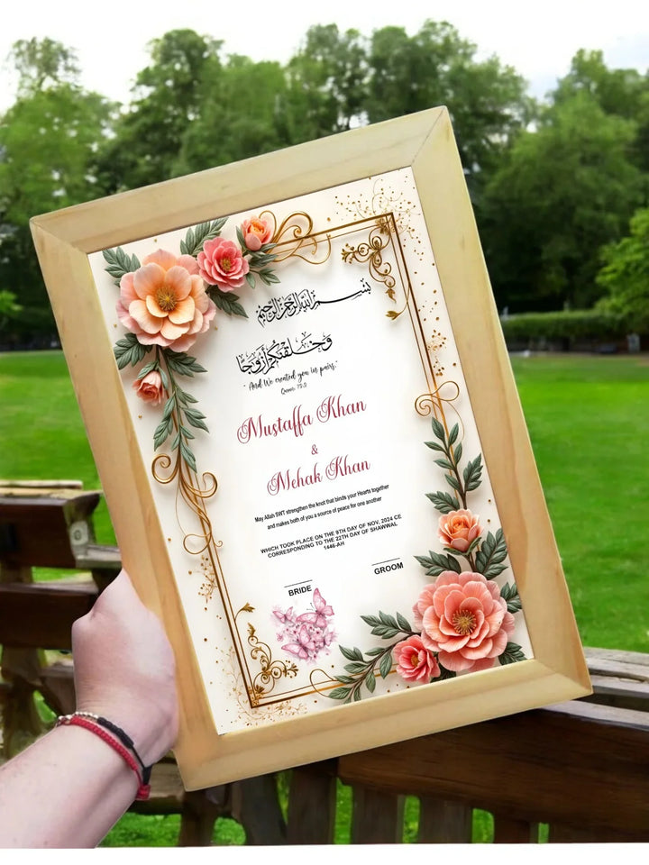 Crafted with premium materials and adorned with a beautiful floral print design, the Throne of Flowers Nikah Frame adds a touch of elegance and warmth to any space. Its vibrant yet graceful design makes it a perfect keepsake for newlyweds and a meaningful Islamic wedding gift that will be cherished for years.