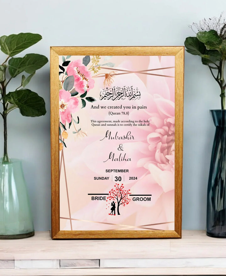 Each frame is fully customizable, allowing you to include the couple’s names, Nikah date, and a Quranic verse or Dua — creating a unique and heartfelt masterpiece that reflects your love and spirituality.